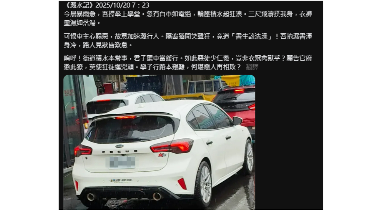 近日一場「白車濺水事件」在社群引發熱議,一名高中生上學途中,遇到一輛白車疾駛而過,由於路面積水,學生被濺得全身濕透,氣得在Threads連發十餘篇文,從白話文到文言詩罵到英文詩、散文,題材多樣、筆鋒犀利,被網友封為「滿級分復仇文」。不料網友循線找出車主後,車主竟留言反嗆,還向警方報案提告,讓網友們譁然。