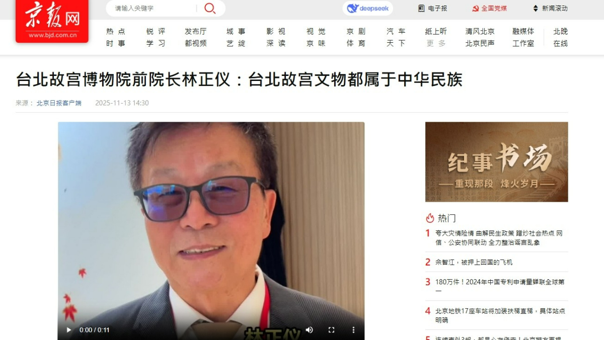 今年是中國北京故宮建院100週年,北京舉行第11屆中華文化論壇,《北京日報》今天(11/13)報導,論壇期間我故宮前院長林正儀受訪時表示:「台北故宮的文物都是屬於中華民族的重要文物。」