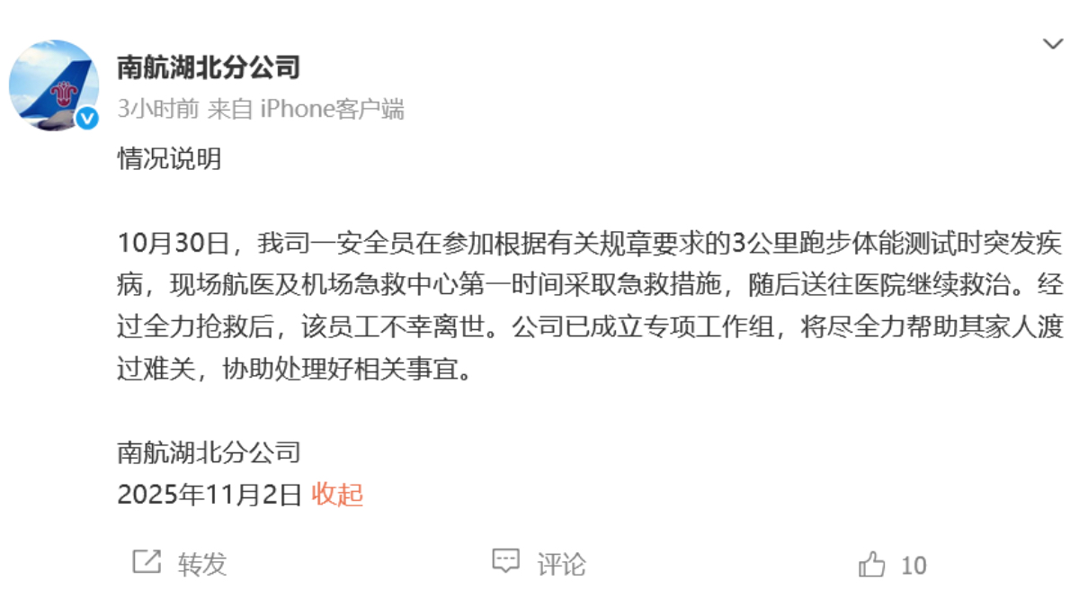 中國南航湖北分公司官方微博今天(11/2)發布「情況說明」表示,一名男性安全員上週四(10/30)參加3公里跑步考核測試時突發疾病,現場急救後送醫,不幸仍於隔日(10/31)死亡。中國媒體指死者年約38歲。