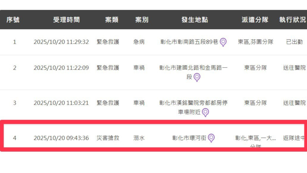 彰化市環河街今(20日)上午9時許發生一起溺水案,一名婦人疑似不慎,掉進環河街旁邊的「洋厝排水圳溝」,丈夫見狀急忙跳水想救人,沒想到最後雙雙溺水,被救護人員救起時已無生命跡象,分送彰化基督教醫院、彰化秀傳醫院搶救。