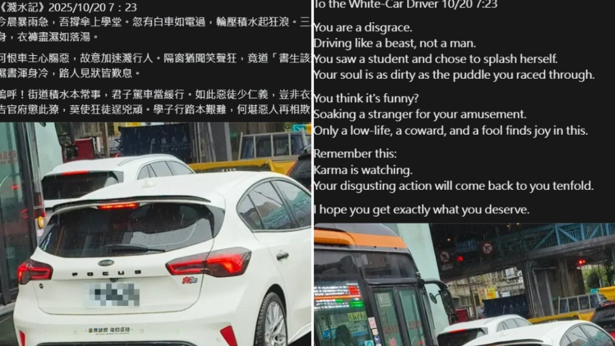 高中生太有才?北部近日連續豪雨,竟造就一段古文引論戰。一名高中生於10月20日上午上學時,因為大雨緣故,遭到路上一台白色轎車疾駛濺得全身溼透,高中生氣炸因此在Threads連發數篇的「濺水記」埋怨白車車主,且高中生除了古文、英文、散文都發揮創意,讓不少人莞爾一笑。但車主看見貼文卻笑不出來,直接回嗆,「邏輯有問題去看醫生」,更貼出報案證明單。警方也證實,車主已提告。