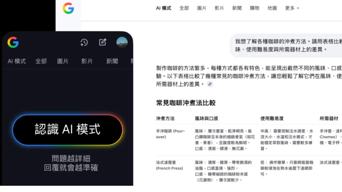 Google近日在台灣推出Google搜尋的AI模式,透過Gemini模型的客製化版本,讓過去可能需要多次搜尋才能解答的複雜問題,透過AI模式能一次解決,且不僅限於文字,也能透過語音、拍照或上傳圖片來使用,讓「搜尋」能夠比以往更深入地探索網路,幫助使用者找到令人驚豔、高度相關的優質內容。