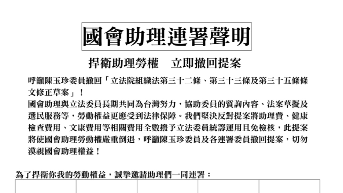國民黨立委陳玉珍提案讓助理費除罪化,交立委統籌運用、免檢據核銷,引發基層國會助理炸鍋。助理發起撤案連署,目前已有共計75間辦公室及252位助理參與連署,明日(12/11)連署發起人將於上午8時50分在紅樓三樓,誠摯邀請朝野委員一同連署,期盼朝野委員與助理們站在一起,共同守護勞權。