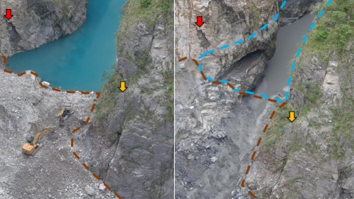 立霧溪燕子口堰塞湖17日形成後,隨即展開降挖引流作業,這幾天上游持續降雨,今(10/29)上午11時過後溢流增加,至11時40分幾乎完全潰決,所幸應變得當、未釀災情,下午4時20分正式解除警戒。林業署隨後曝光堰塞湖前後對比照,可見蒂芬妮藍湖水已經消失,靳珩隧道西口再度重現光明。