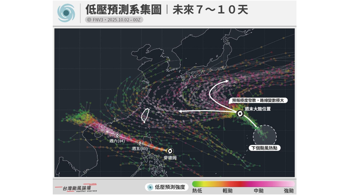 中秋連假後緊接著就是雙十連假,不少民眾都有出遊的計畫,氣象粉專「台灣颱風論壇|天氣特急」今PO出AI路徑預報系集圖(10/3)指出,除了確定不侵台的麥德姆颱風以外,遠洋的低壓也持續發展,預計再過幾天,會成為下個颱風「哈隆」,是否將成為「國慶颱」仍有不小變數,需要密切關注。