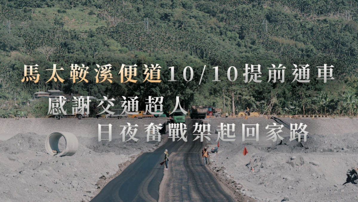 花蓮光復鄉因上月23日馬太鞍溪橋遭洪水沖斷,交通一度中斷長達半月,影響救災與居民往來。歷經500人次、日夜趕工超過兩週後,交通部長陳世凱今(10/9)宣布,便道將於明(10/10)日下午3時雙向通車,率先開放5噸以下小型車與救災車輛通行。相較繞行193縣道或光豐公路,將可節省約30至40分鐘車程,自花蓮市區僅需10分鐘即可抵達光復鄉。