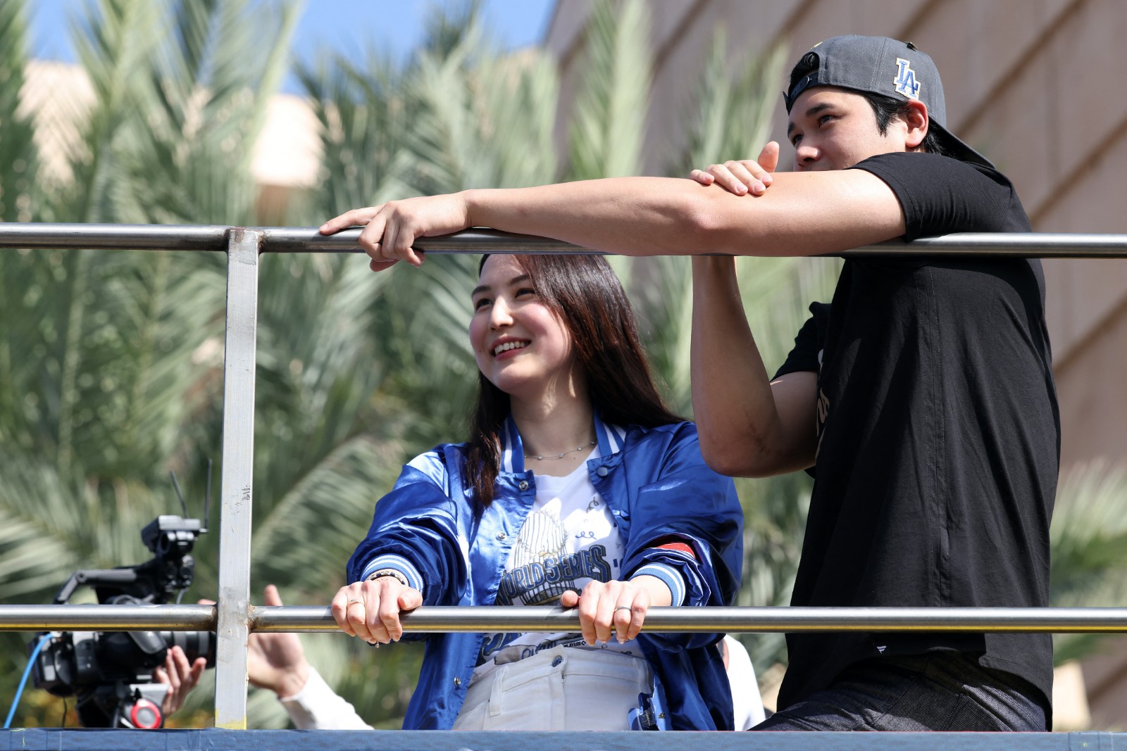大谷翔平身穿世界大賽冠軍T恤登場,並與身穿藍色夾克的妻子真美子一同參加出席,大谷接受現場訪問,他以英語對球迷致詞時說道:「你們是世界上最好的球迷。我已經準備好明年再拿一枚總冠軍戒指了!」
