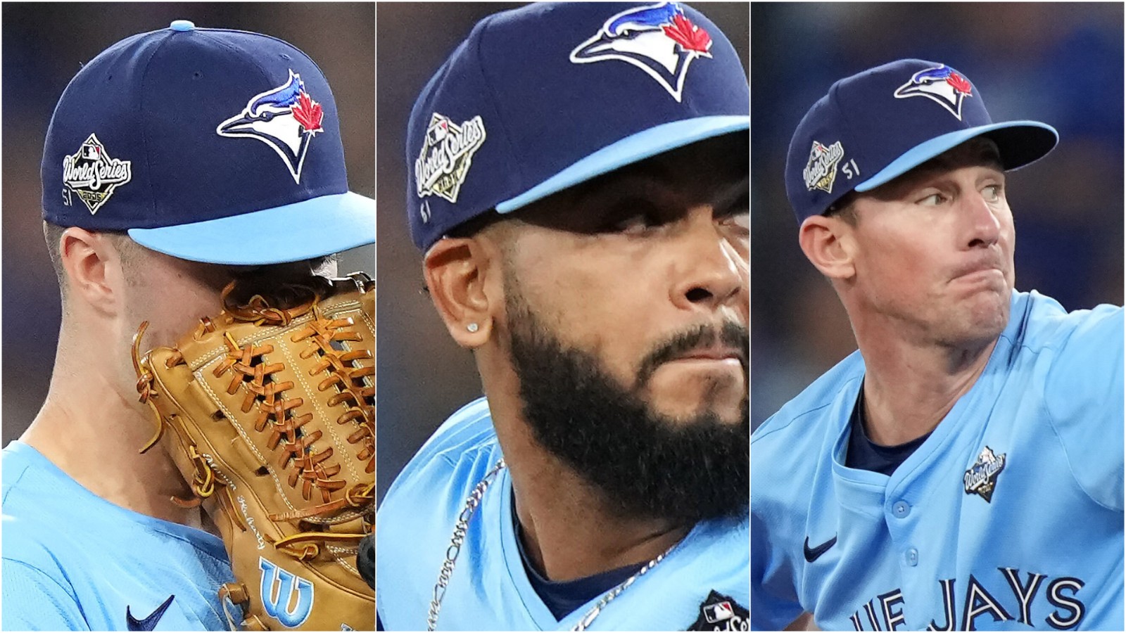 超越勝負的感動!多倫多藍鳥3名後援投手(左起Mason Fluharty、Seranthony Dominguez、Chris Bassitt)在帽子寫上51,為洛杉磯道奇因故暫時離隊無緣世界大賽的左投Alex Vesia表達支持與關心。美聯社