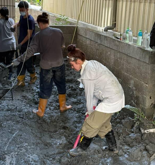 李多慧今天素顏現身光復鄉救災,加入「鏟子超人」行列,照片中她在泥濘中挖土,雖然辛苦但仍帶著笑容,也有累了的時候,倚靠在牆邊休息的模樣。經紀人表示「多慧想要安靜地付出、不讓人知道!」