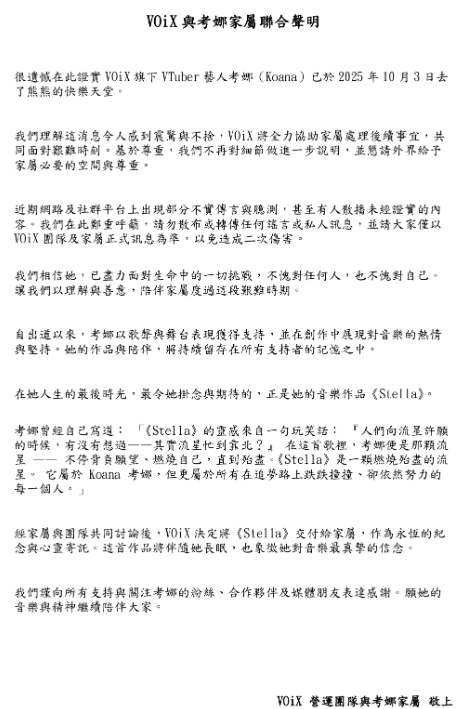 VTuber「Koana考娜」2025年10月3日離世。取自VOiX臉書