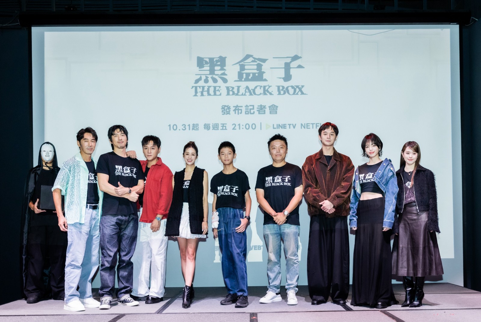 李李仁(左起)、傅孟柏、鄭人碩、莫允雯、洪君昊、導演李昭樺、陸夏、張軒睿、邱偲琹出席《黑盒子》發布記者會。LINE TV提供