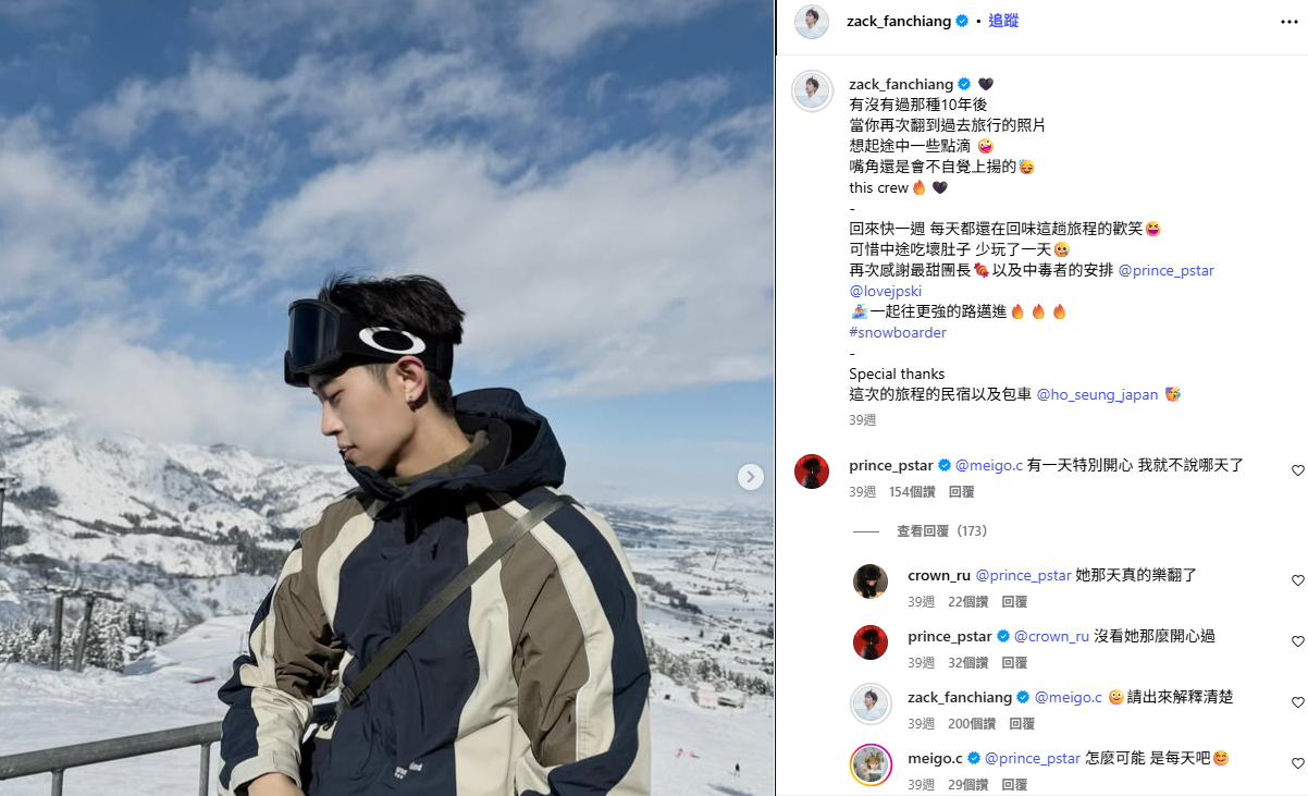 網友翻出3人過往的社群互動,今年1月,范姜與粿粿、王子、簡廷芮等人赴日本滑雪,范姜當時還在IG感謝「最甜團長王子」的安排行程,開心回憶「每天都還在回味旅程的歡笑」,王子則在底下留言標註粿粿:「有一天特別開心,我就不說哪天了,沒看她那麼開心過。」粿粿則笑回「怎麼可能,是每天吧。」范姜回應「請出來解釋清楚」,這段對話如今看來頗為諷刺。