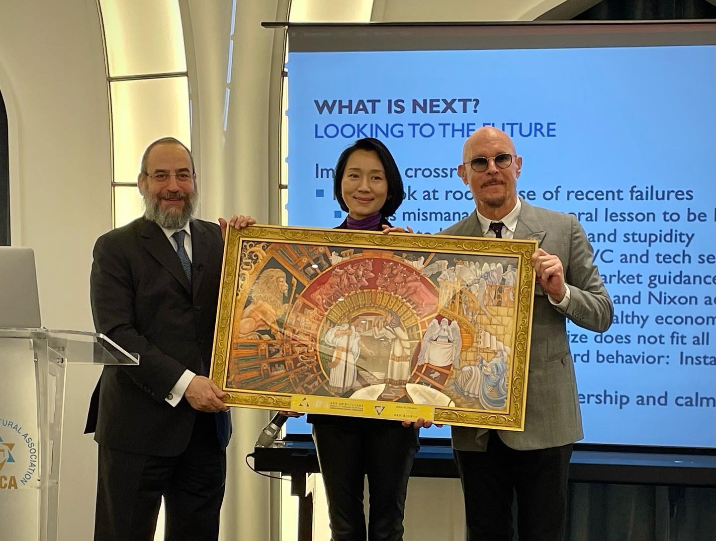 薛智偉回顧他與坣娜從2017年結婚,這八年,是他⼈⽣中最充滿啟發與感動的時光。他談到,自己本是經營事業的商⼈,覺得顧好⾃⼰顧好家⼈就⾜夠,直到有⼀天,坣娜問他:「你願不願意為臺灣做點什麼?」這句話徹底改變了他的⼈⽣⽅向,「在她的啟發下,我創立了JTCA猶台⽂化交流協會,希望透過猶太與台灣⽂化的交流,讓世界看⾒臺灣」。