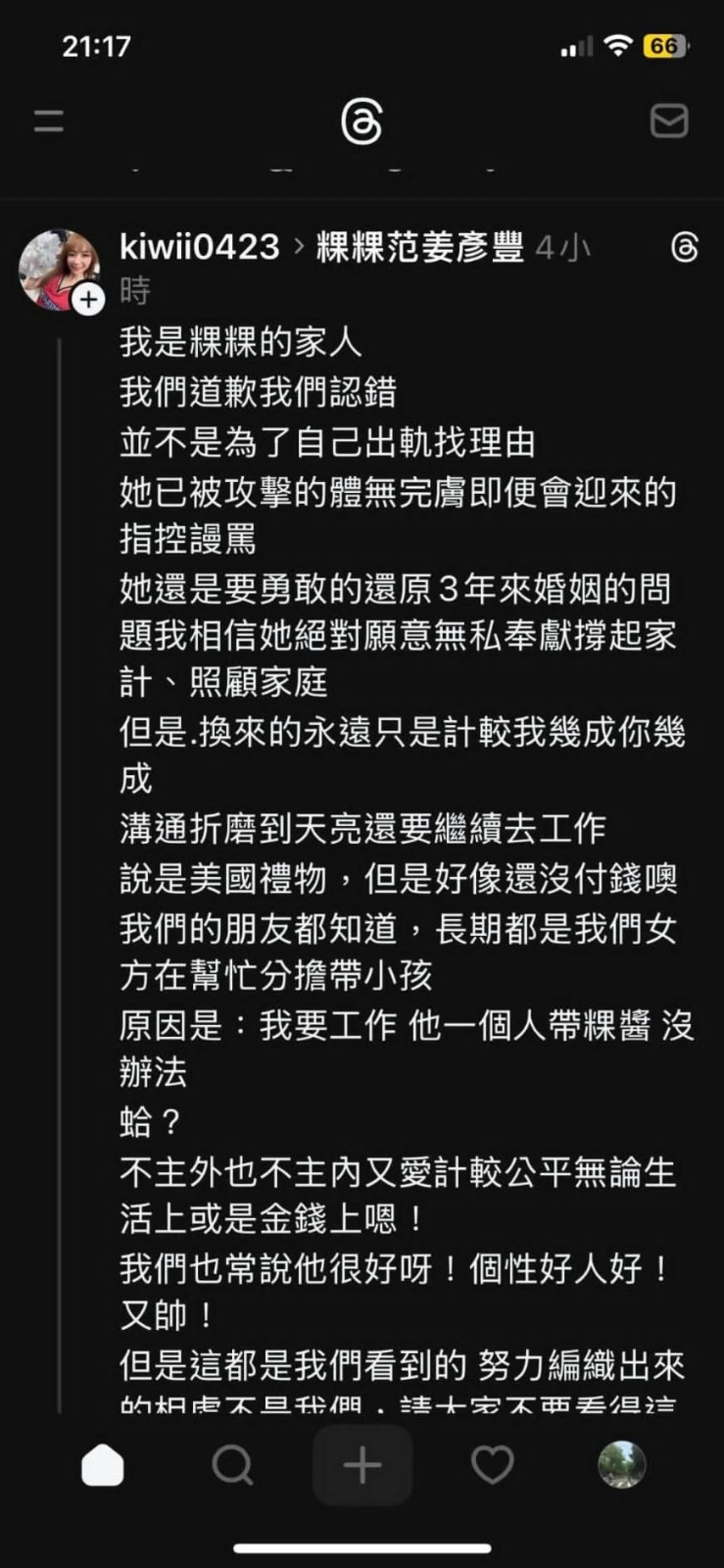不過輿論持續沸騰之際,網路上卻流傳多張Threads截圖,有網友發現多個帳號都以「粿粿家人」或「支持者」名義發文,且內容幾乎一模一樣,開頭都是「我們道歉、我們認錯,但不是為了出軌找理由…」甚至還有一張截圖驚見括號註記「(一個帳號1000記得刪掉)」,疑似付費網軍操作曝光。