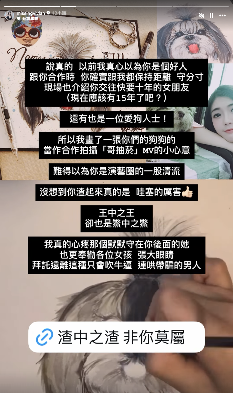 謝薇安說,黃明志也是一位愛狗人士,讓她難得以為是演藝圈的一股清流,「沒想到你渣起來真的是哇塞的厲害」,痛批他:「王中之王,卻也是鱉中之鱉。我真的心疼那個默默守在你後面的她,也更奉勸各位女孩,張大眼睛,拜託遠離這種只會吹牛X、連哄帶騙的男人」,並在「渣中之渣非你莫屬」。