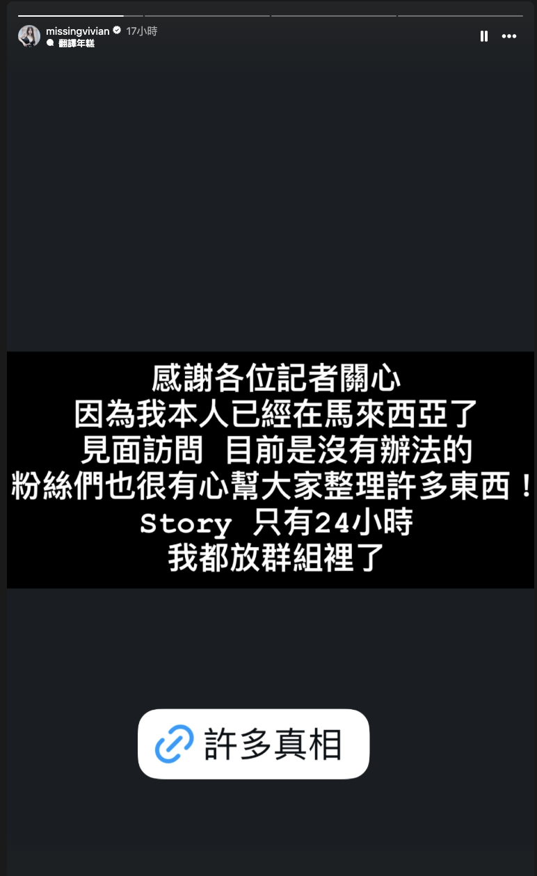 謝薇安後續也再度發文感謝大家關心,她人現在已經在馬來西亞了,雖然目前無法見面受訪,但粉絲們很有心幫大家整理了許多東西,希望大家能繼續關注,盼真相能儘早水落石出。