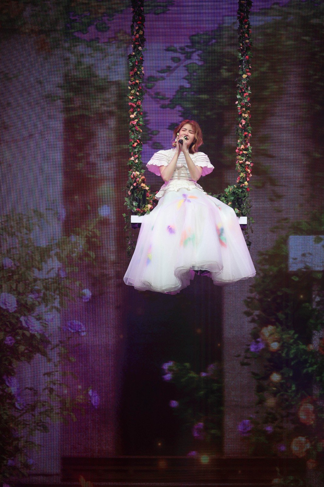 曾沛慈坐在花朵鞦韆上以〈搶先看〉華麗登場。寬宏藝術提供