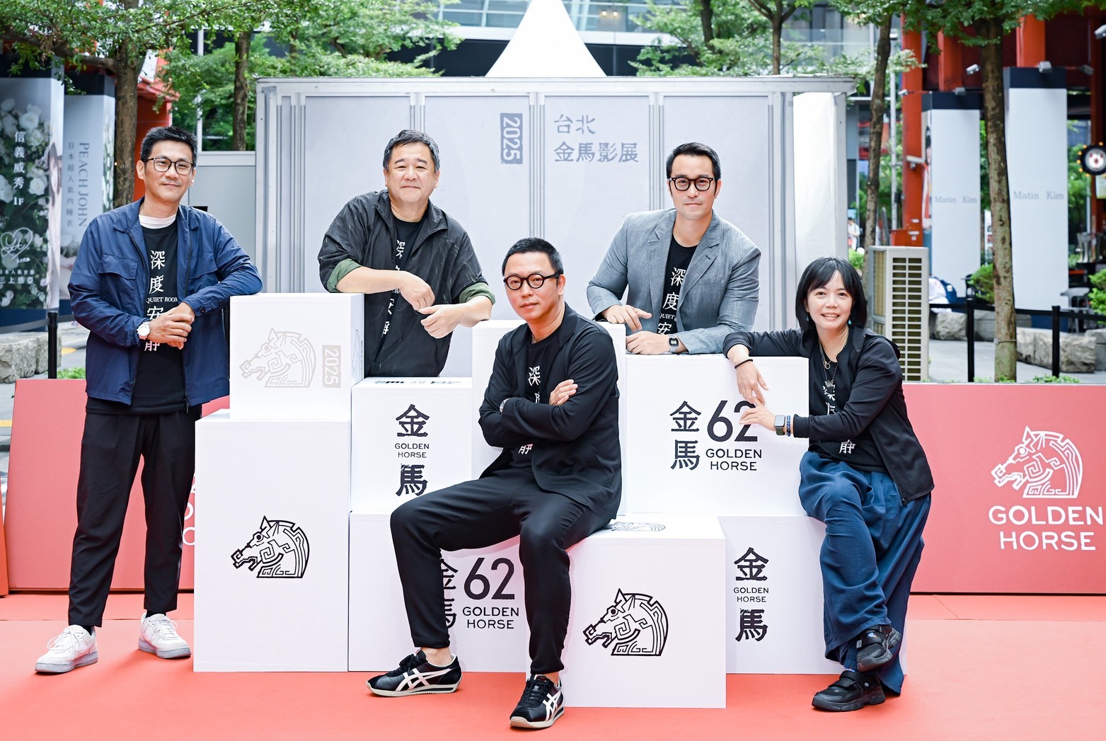陳大璞(左起)、瞿友寧、沈可尚、張孝全、蔡珮玲齊聚金馬星光舞台。金馬執委會提供