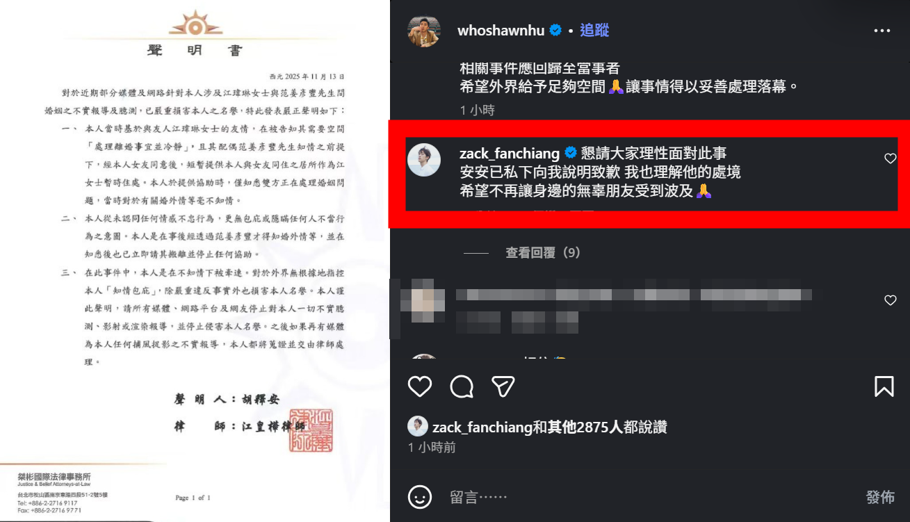 范姜出面留言替胡釋安澄清。翻攝自IG