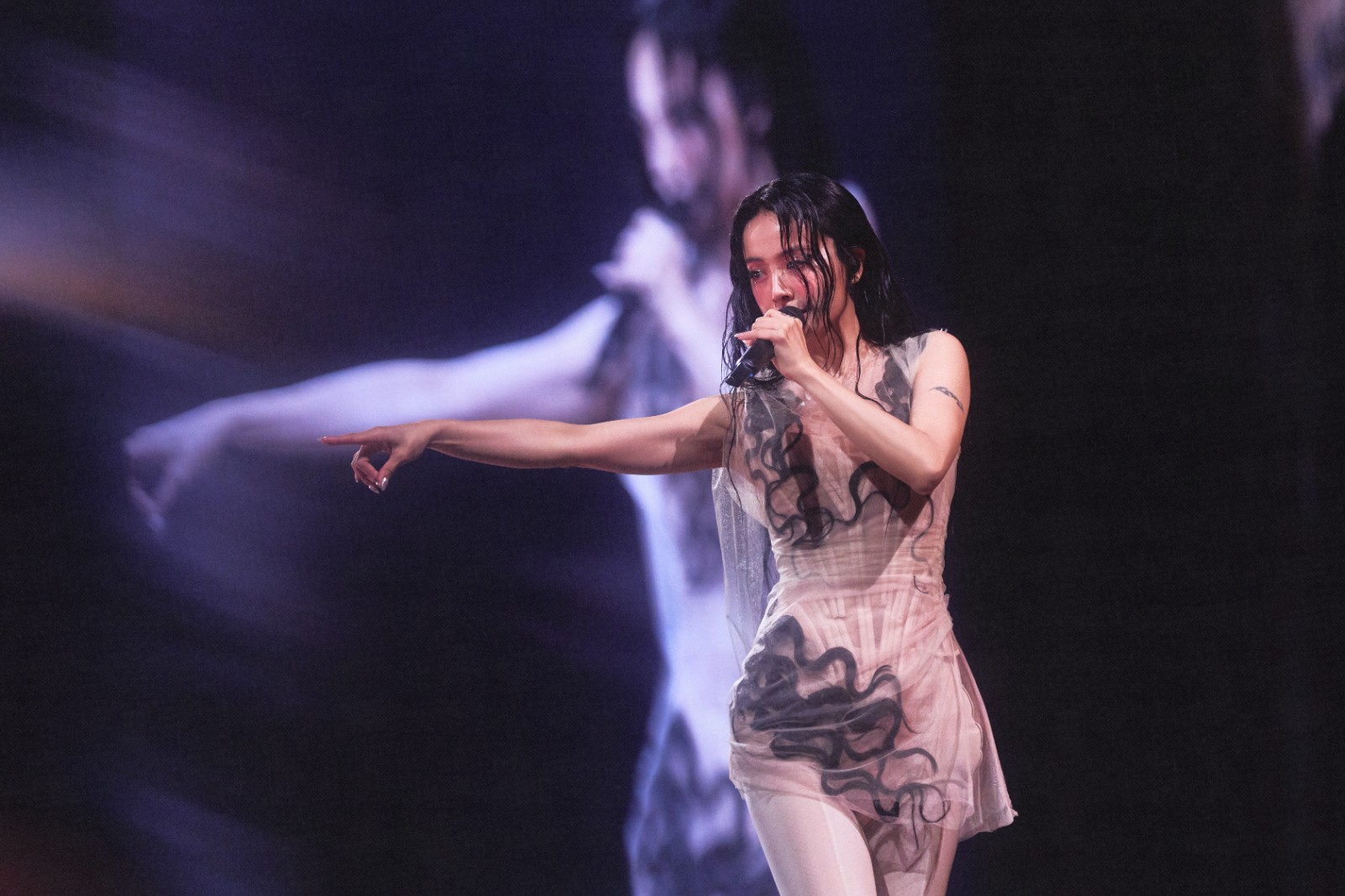 還有一套是融合性感、戲劇性及黑暗浪漫的語言,配上裸膚色為底、黑色如秀髮般的線條設計,讓蔡依林全身彷彿被纏繞著,身材在燈光下若隱若現,傳達魅惑動人的情緒。