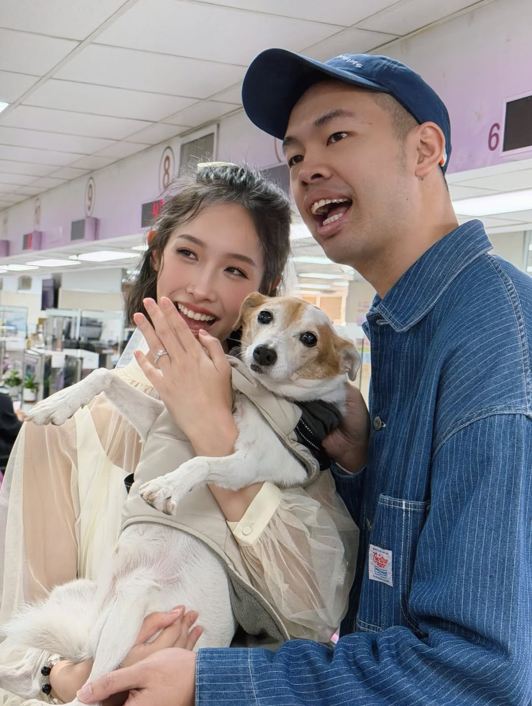 陳大天與劉樸登記結婚,愛犬「蝦米」盛裝出席。伊林娛樂提供
