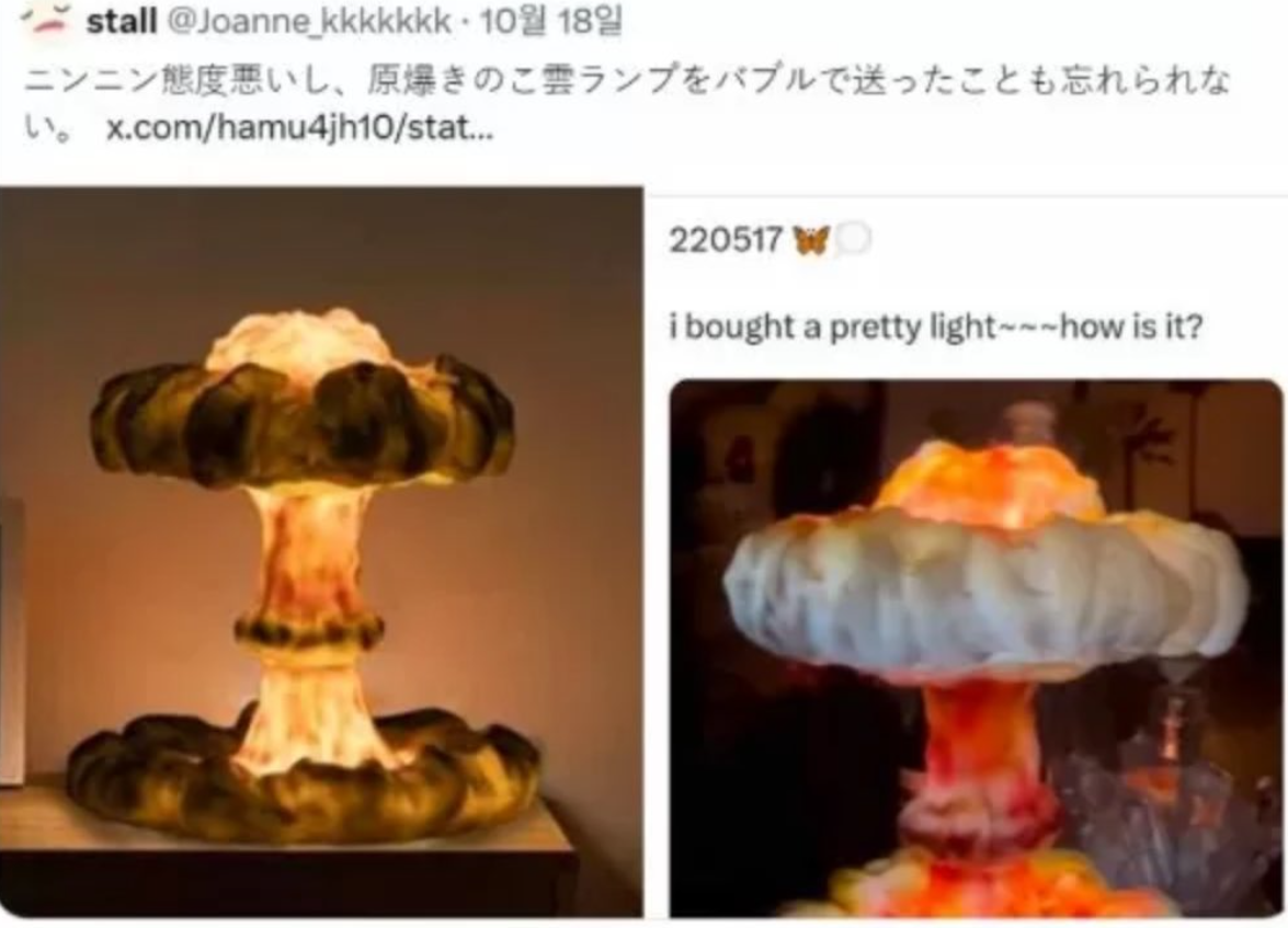 aespa因成員寧寧2年前買了一盞蘑菇雲造型的檯燈,遭日網抵制。翻攝自IG