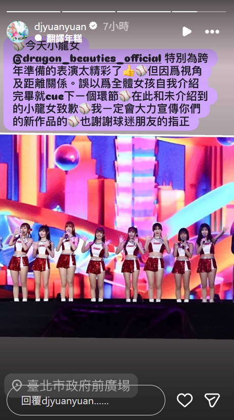 2026台北最HIGH新年城跨年晚會上,DJ圓圓打斷小龍女自我介紹,在IG限動致歉。翻攝自