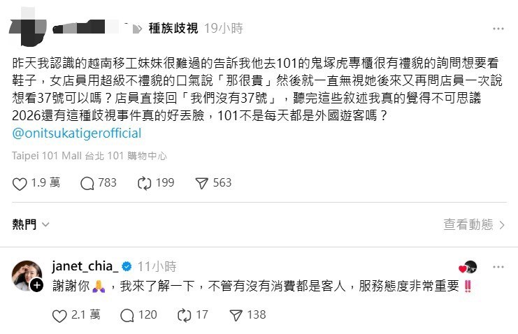 網友分享越南籍移工在台北101的鬼塚虎專櫃受到櫃員歧視,賈永婕親自回應會了解此事。翻攝自Threads