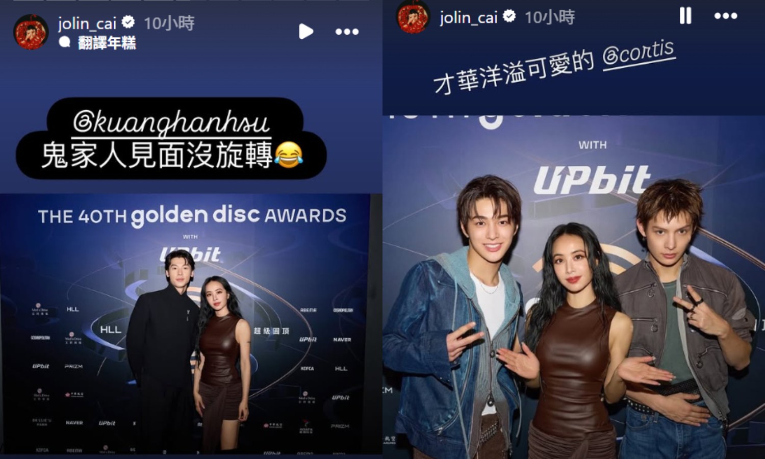 南韓第40屆金唱片獎頒獎典禮10日移師台灣大巨蛋,當天台韓兩地眾星雲集,台灣天后蔡依林(Jolin)也受邀擔任頒獎嘉賓,落落大方轉換3國語言,驚豔動人。事後,蔡依林在IG限動上傳多張與怪物新人團體CORTIS、男神許光漢,還和低調的小S世紀合影,讓網友們好驚喜。