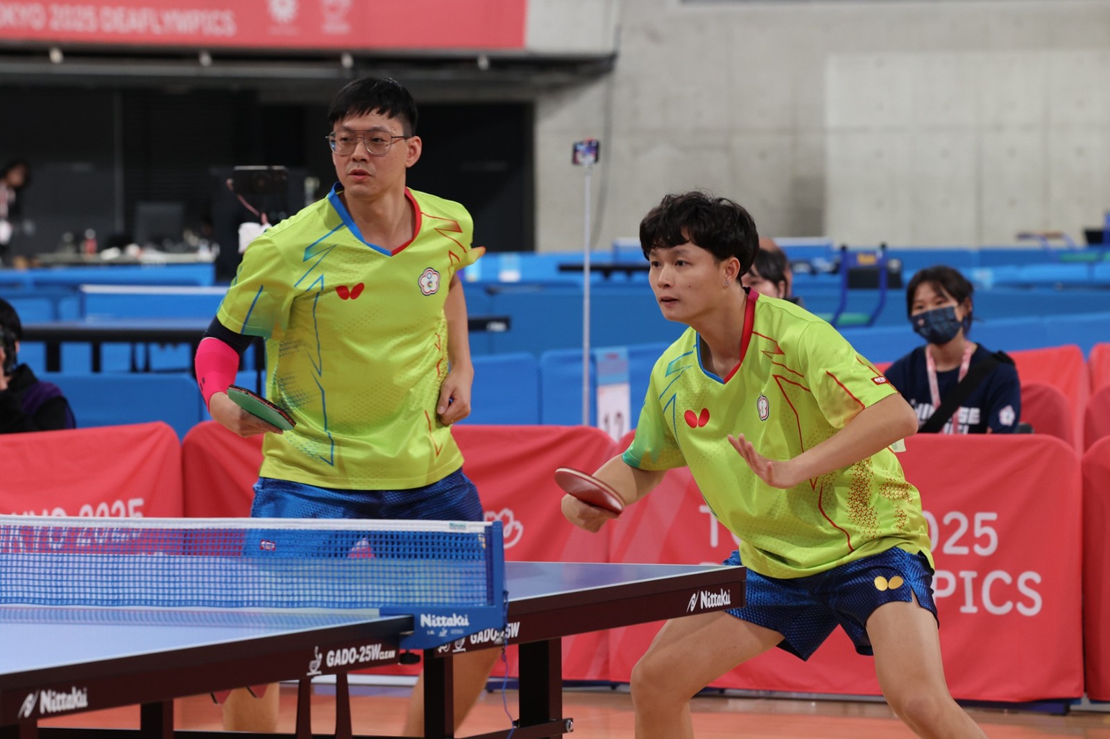 本屆聽奧的桌球賽程變革,以往在賽程後半段的個人賽項目在本屆賽會率先登場,我國男子桌球隊在今天的雙打賽事中,由王顗翔搭配楊榮宗、盧仕杰搭配郭岳東兵分兩路出擊。我國男雙組合在2017年薩姆松聽奧曾由王楊組合拿下銀牌,本屆兩組男雙聯袂晉級四強奪牌是我國參賽史上首見,展現我國聽障桌球隊穩定、堅強的實力。