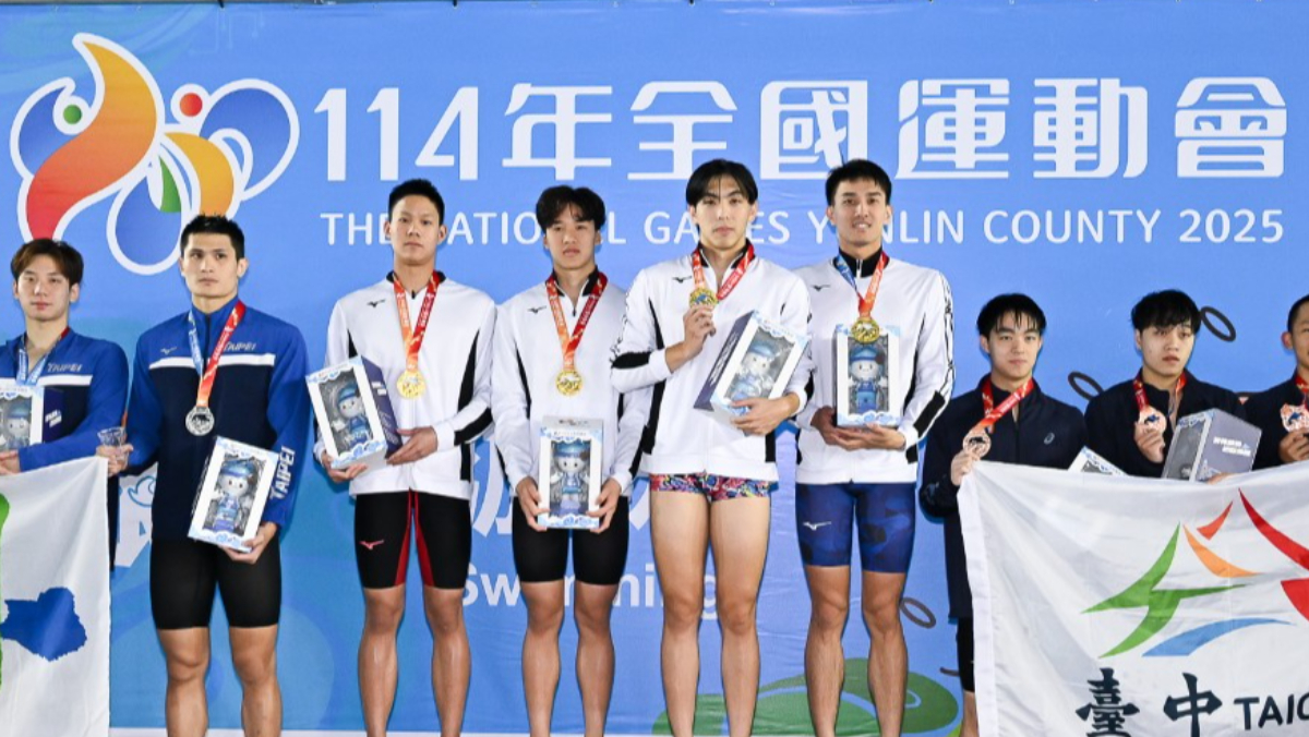 男子組游泳4×100公尺自由式接力安廷耀、李瀚、林怡成、莊沐倫獲金牌。114年全國運動會籌備處提供