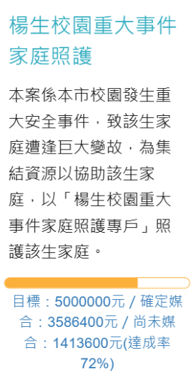 還有人問到「想請問有沒有什麼方法可以真正幫助到國中生割頸案的爸爸?」事實上,新北市社會局早自去年1月6日就推出「楊生校園重大事件家庭照護」專案募款,截止今天(12/24)中午為止,距截止日今年12月31日只剩8天,離目標500萬元還差141萬3600元,達成率72%。