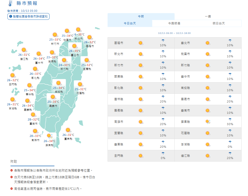 氣象署指出,今日(10/13)各地天氣為多雲到晴,東半部、恆春半島有零星短暫降雨,午後嘉義以南、山區有局部短暫雷陣雨。溫度方面,東半部高溫約31至32度,西半部高溫約32至35度,其中大台北、中南部近山區有局部36度以上高溫發生的機率,從事戶外活動請注意防曬並多補充水分。離島天氣:澎湖、馬祖皆為晴至多雲,26到31度;金門晴至多雲,26到32度。