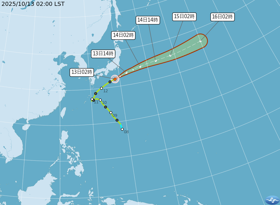 至於中颱娜克莉,吳德榮指出,根據氣象署最新路徑潛勢預測圖顯示,娜克莉今日在日本南方海面持續向東北東加速前進,追隨哈隆颱風路徑,下午起遠離日本。