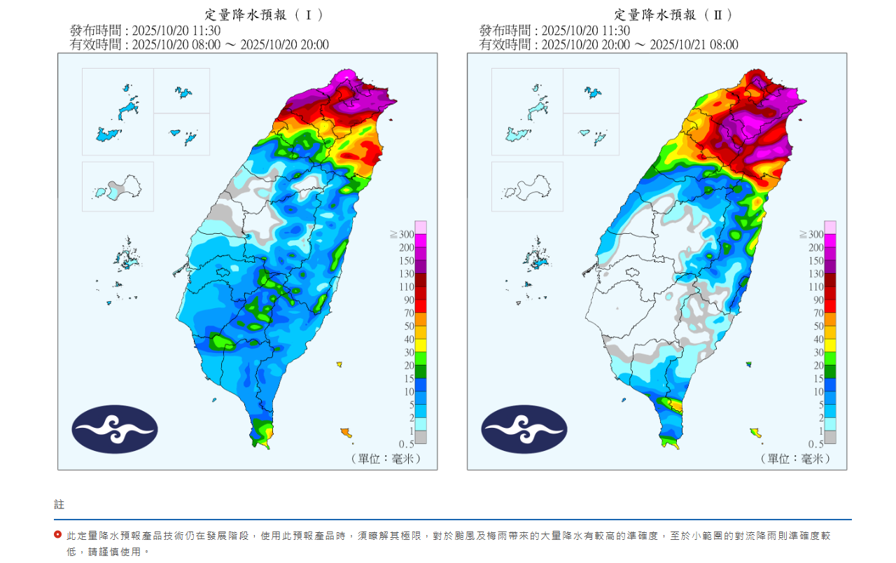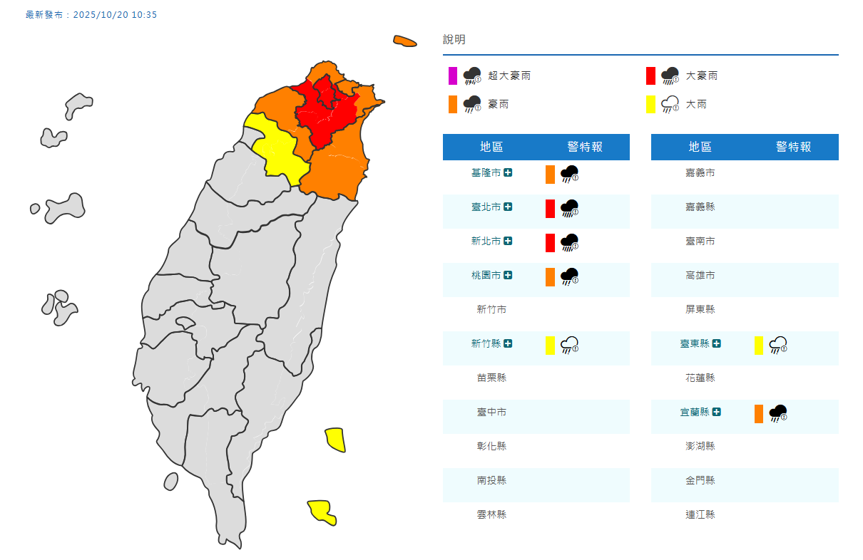 台灣今(10/20)受到風神颱風外圍環流與東北季風共伴效應影響,出現驚人雨勢,氣象署稍早對雙北發布大豪雨特報,基隆、桃園、宜蘭豪雨,新竹與綠島蘭嶼則是大雨示警。氣象專家「台灣颱風論壇」稍早表示共伴效應的交戰區有下不完的雨,依據目前狀況,北部、東部還得下2、3天,「建議北部、宜蘭皮繃緊」。