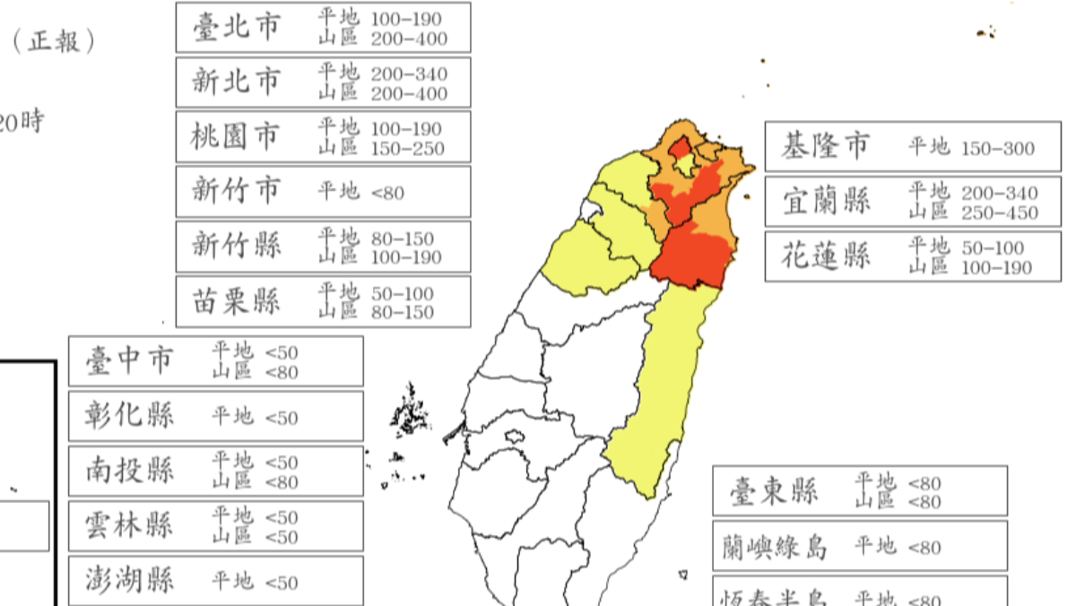連續豪雨襲擊北台灣,因為東北季風及低壓帶的雙重影響,台灣北部地區及東北部地區遭到雨彈狂炸,總雨量上看1100毫米。中央氣象署今天(10/21)下午4點公布最新雨量預測,今天晚間8時至明天晚間8時,有4縣市山區雨量仍達停班課標準,雙北市山區24小時雨量上看400毫米,宜蘭山區也有450毫米。是否停班停課,依照各縣市政府決策公布為準。