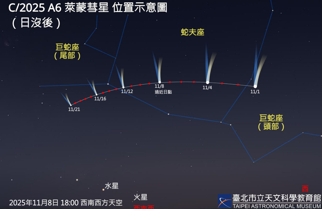 台北天文館說明,因此從今天開始到11月8日之前,萊蒙彗星用雙筒望遠鏡就可以觀察,條件良好狀況下,還有機會用肉眼看見,建議民眾把握約晚間6時日落天黑後的1小時內,在視野開闊且光害較少的地點,往西方低空搜尋其身影。