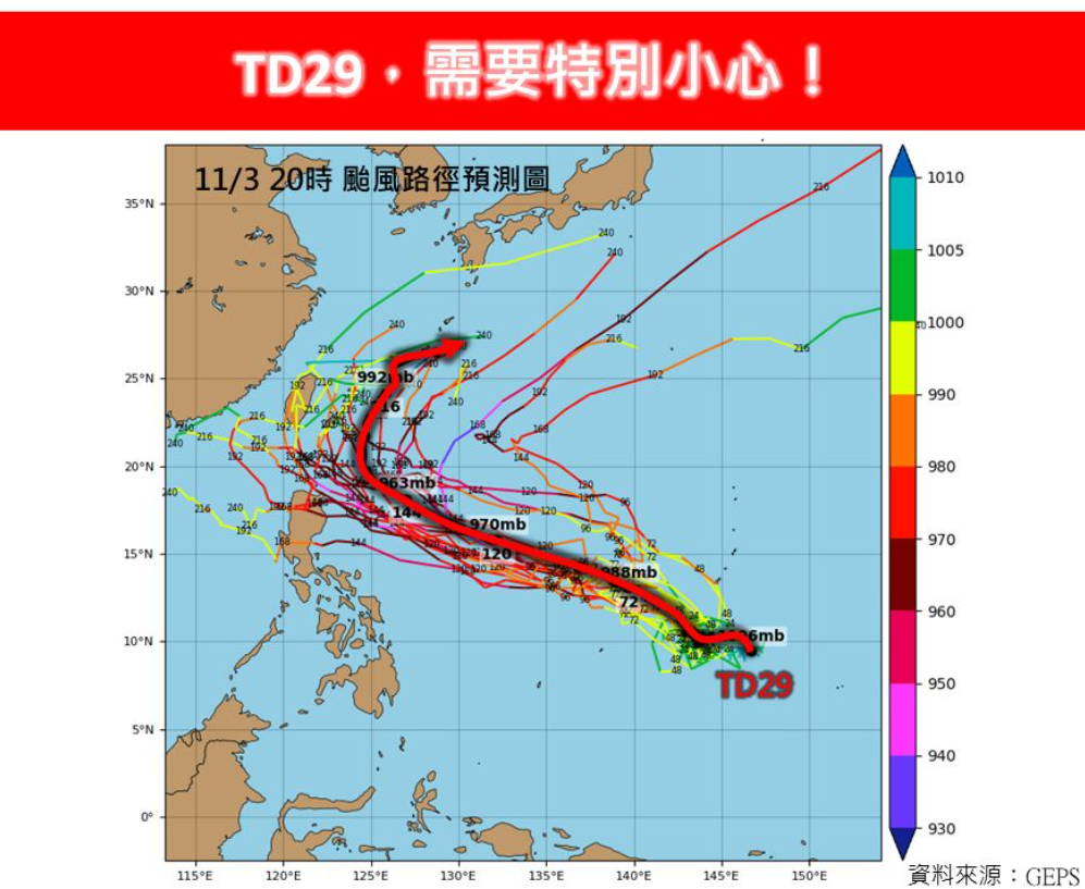 不過,針對TD29動態,林得恩今天清晨在臉書「林老師氣象站」特別提醒,「TD29,需要特別小心!」