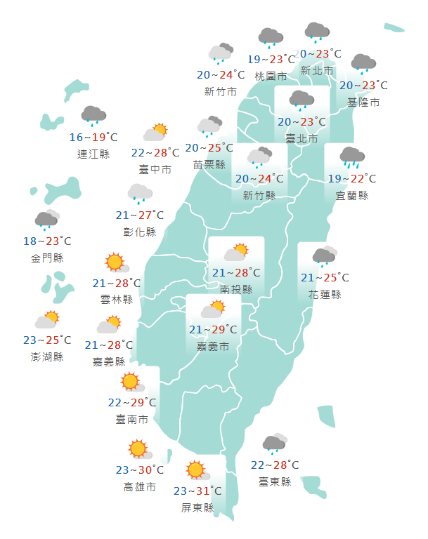 氣溫方面,北部、宜花地區天氣較涼,整天氣溫約19至25度,其他地區早晚也涼,中南部及台東低溫21至23度,高溫28至31度,中南部日夜溫差較明顯,請適時增添衣物,白天南北溫差大,南來北往也請多留意。