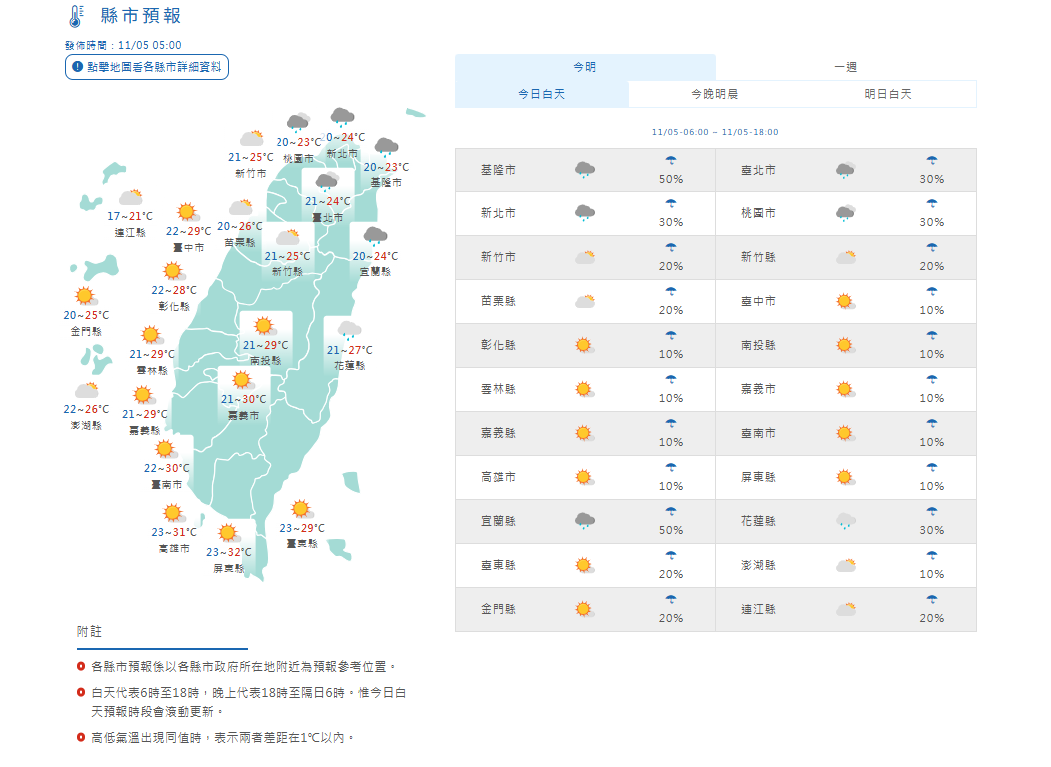 此外,由於東北風偏強,今日清晨至明日(11/6)晚上蘭嶼、綠島、桃園市、新竹市、新竹縣、苗栗縣、台中市、彰化縣、雲林縣、嘉義縣、台南市、屏東縣、澎湖縣、連江縣局部地區有平均風6級以上或陣風8級以上發生機率(黃色燈號),請民眾特別注意。