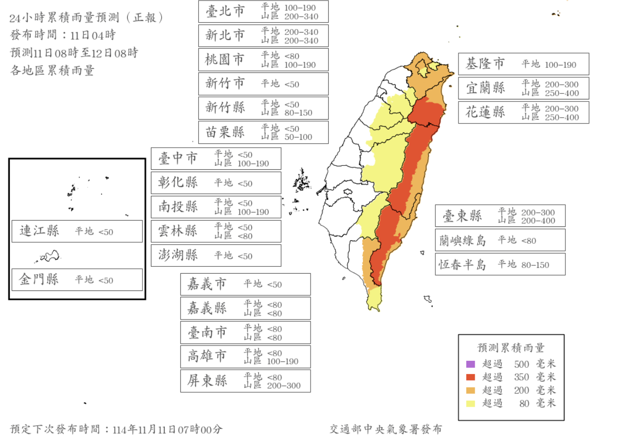 行政院人事總處公布今(11/11)各縣市是否停止上班上課情形如下:基隆市 尚未列入警戒區。