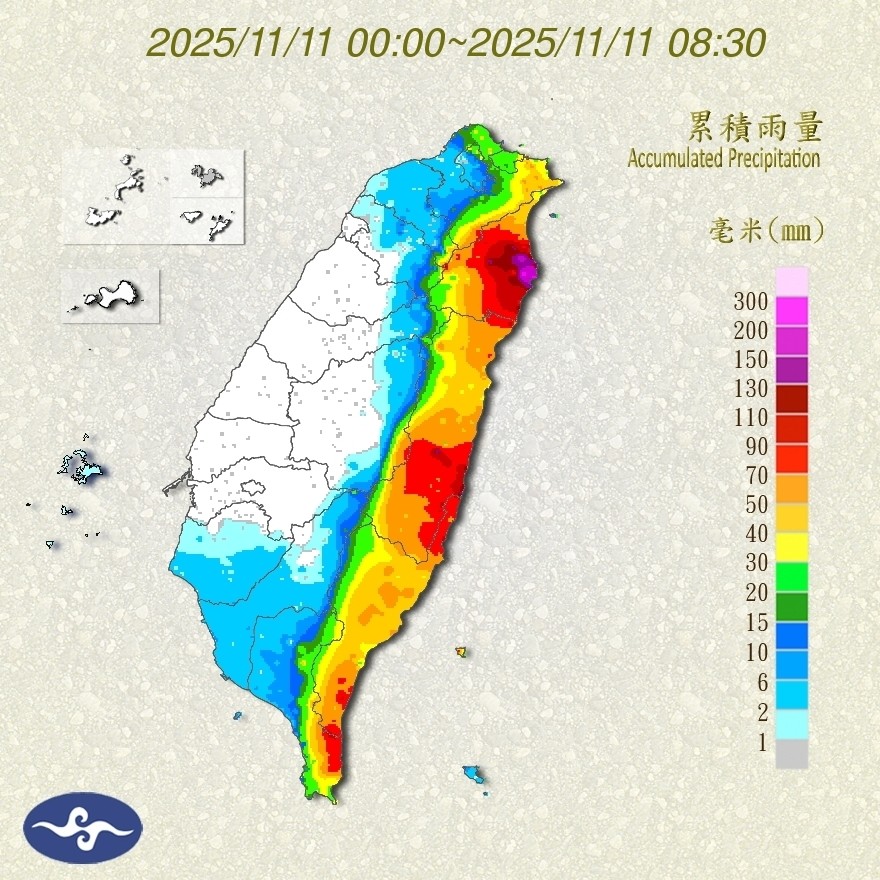 中央氣象署今晨(11/11)4時「最新風雨預報」,今日共有14縣市達停班課標準。廖瑞祥攝