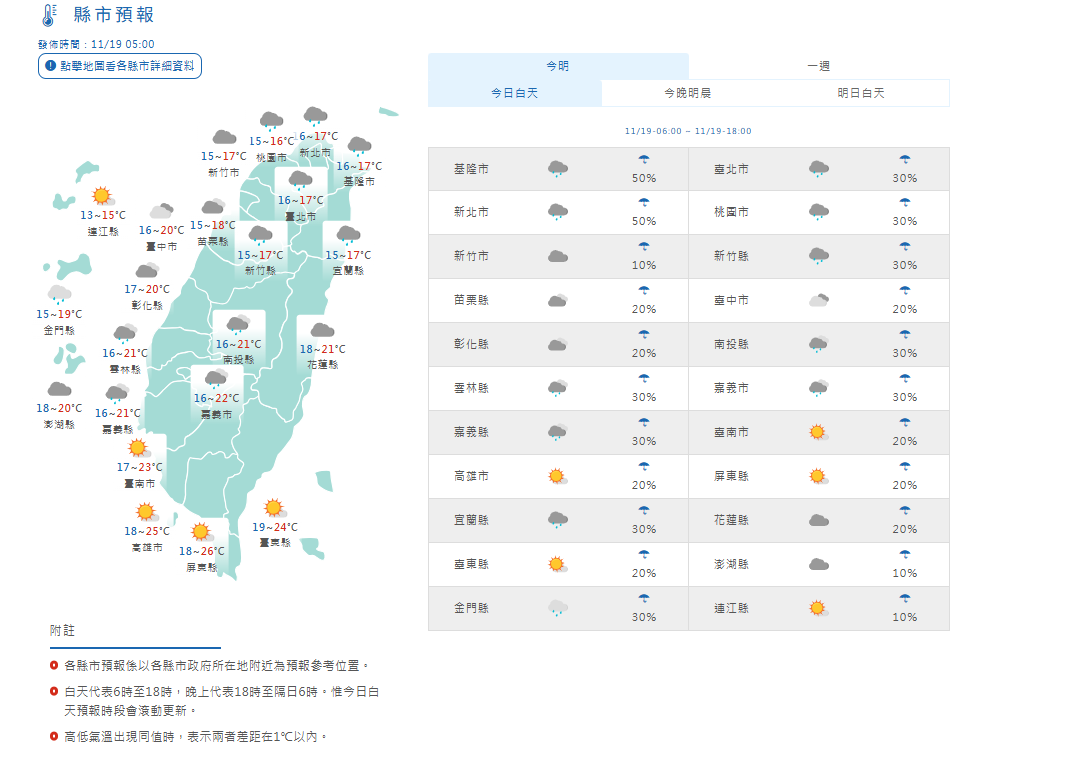 溫度方面,今晨本島縣市平地最低溫出現在新北石門區12.4度,台北市平地最低溫為南港區的13.6度,台北氣象站則降至16.0度,各地區平地最低溫約在12至16度,雖未符合「大陸冷氣團」定義,不過已是今年入秋以來最強冷空氣。明日清晨苗栗以北仍將出現12度左右的平地最低氣溫,應注意調整穿著。今日氣溫北部約12至18度、中部14至23度、南部16至27度、東部15至25度。離島天氣:澎湖陰天,18至20度;金門多雲短暫雨,15至19度;馬祖晴時多雲,13至15度。