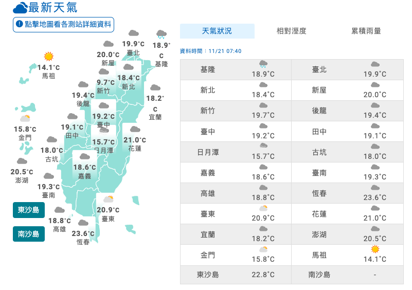 11/21早上各地氣溫。氣象署提供