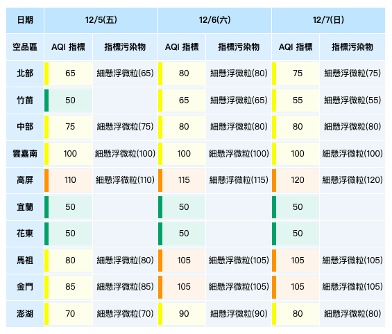12/5~12/7三日空品區預報。環境部提供