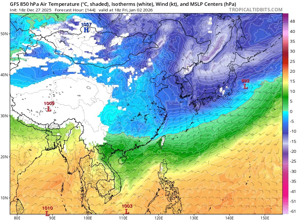 前氣象局長鄭明典今(28日)上午在臉書PO出一張氣象圖說明,通常冬季低溫預報會提到「0度線接觸台灣」,那幾乎肯定是說850百帕等溫線,而為什麼會這麼說,他則解釋,因模式預報的地面溫度通常會有系統性偏差,需要很多「訂正」才能使用,而看850百帕的溫度來推估地面氣溫就是一個方便的替代方案。