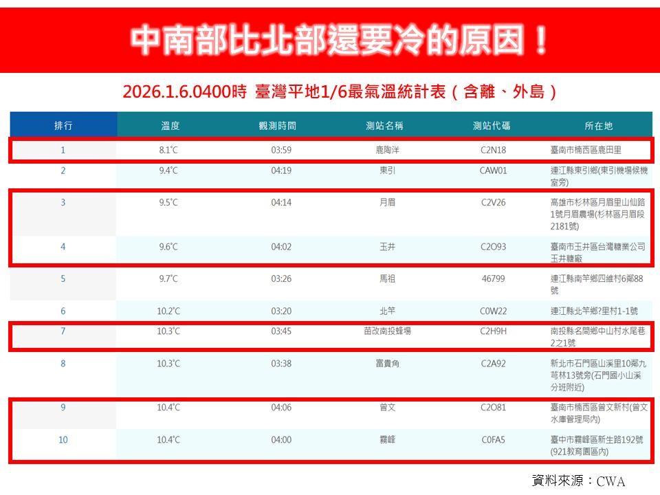 強烈大陸冷氣團來襲,全台今(6日)清晨平地最低溫前三名分別為台南楠西攝氏8.1度、高雄杉林9.5度、台南玉井9.6度,出現中南部比北部要冷的情況。對此,氣象專家林得恩點出4大可能原因,讓中南部的「輻射冷卻」效率高於北部,使清晨氣溫大幅度下降,再加上地形影響,形成「冷空氣堆積」現象。