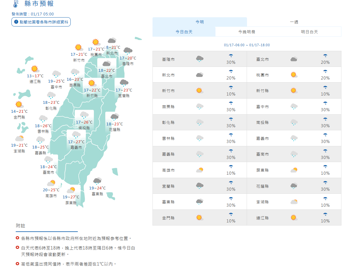 根據中央氣象署凌晨5時發布的氣象報告,受東北風影響,今、明兩天(1/17、1/18)台灣東半部地區、基隆北海岸、大台北山區及恆春半島有局部短暫雨,桃園以北亦有零星降雨,其餘地區以及澎湖、金門、馬祖大致為多雲到晴。