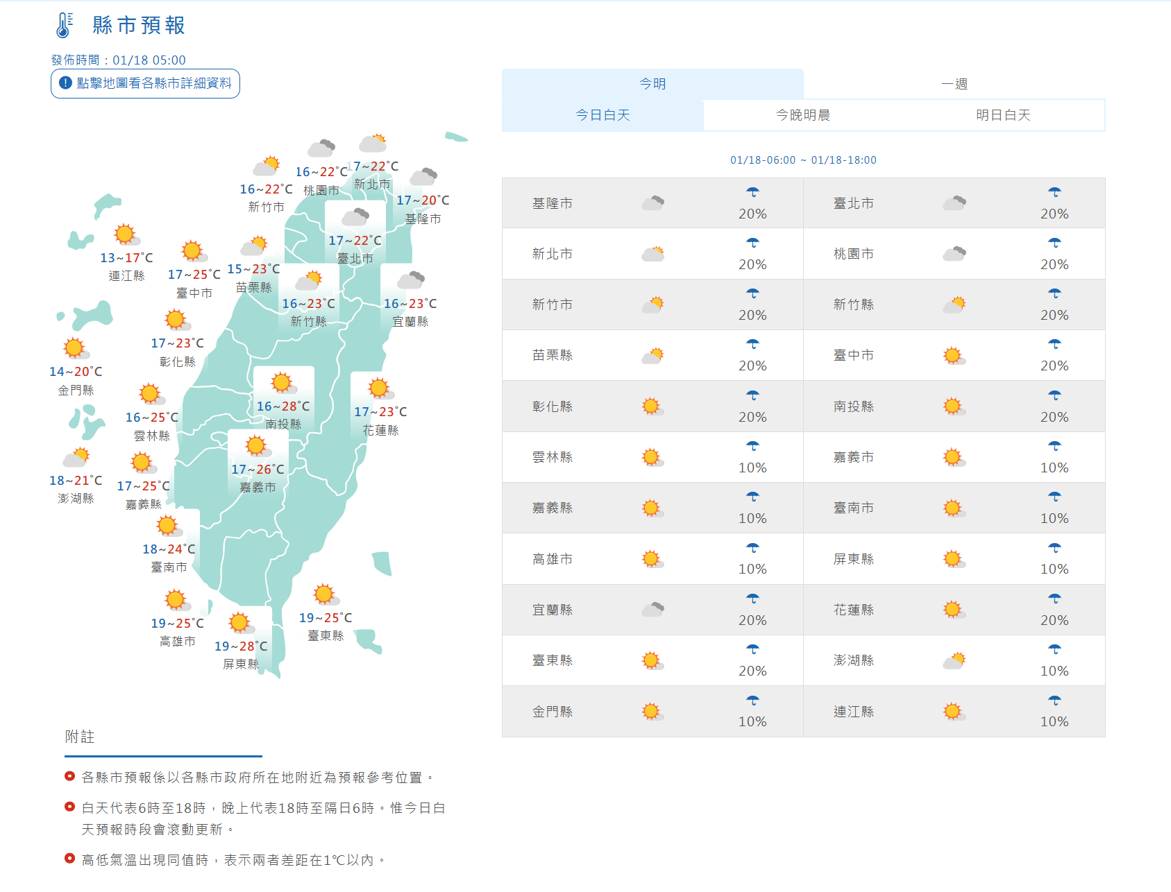 今日(1/18)天氣同樣為白天舒適、早晚較涼,北部及東部地區有零星降雨;明日(1/19)因東北季風增強,水氣會再增加,週二(1/20)還有新一波強冷空氣抵達,本島平地最低溫恐下探至8度左右,且是濕冷多雨的天氣型態。