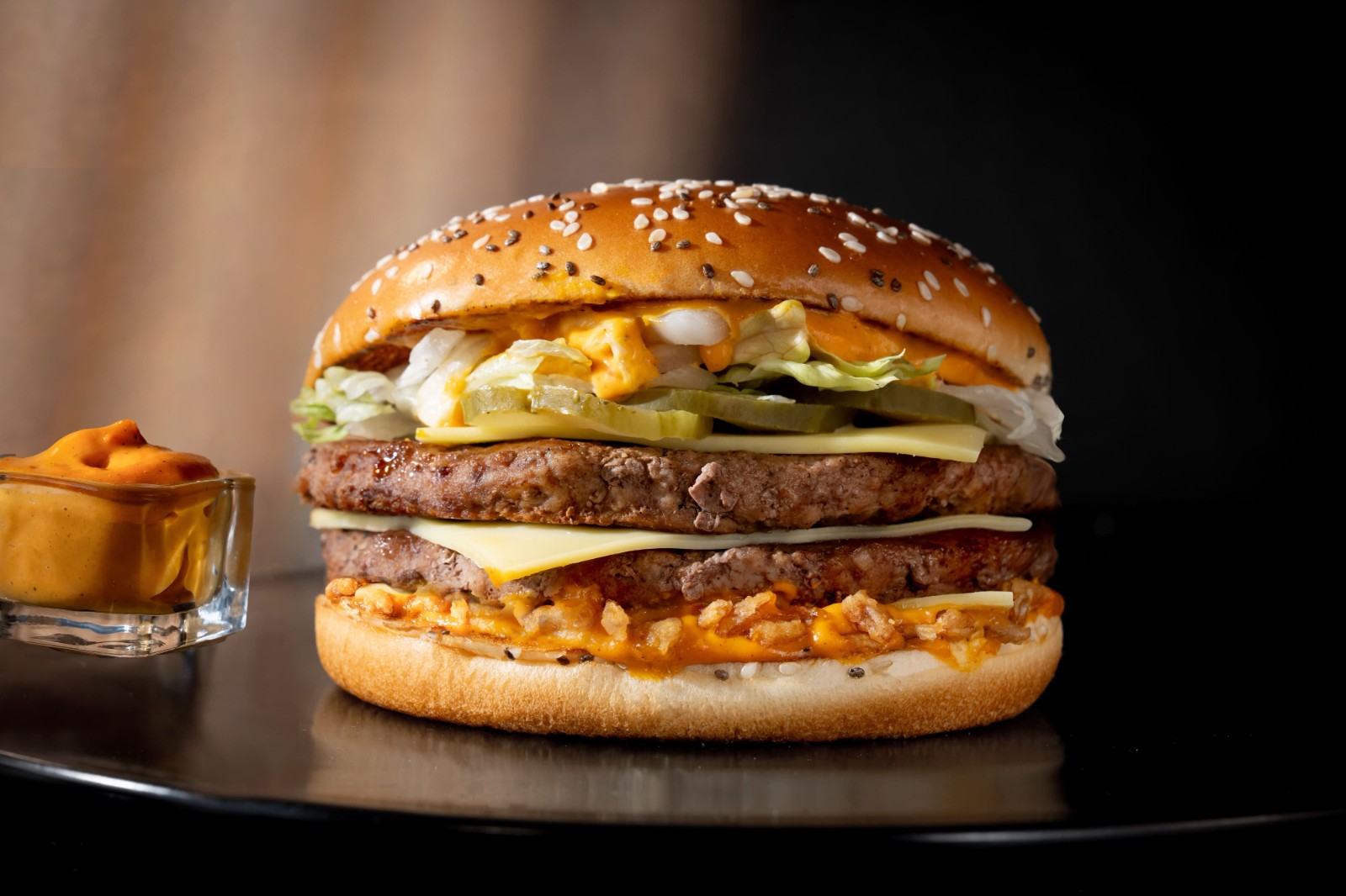 台灣麥當勞指出,「Big Arch霸牛堡」自2024年起在加拿大、德國與澳洲等國家相繼推出,亞洲首發率先在台灣登陸,以芝麻奇亞籽麵包,搭配厚實多汁、牛香四溢的雙層重磅四盎司安格斯牛肉,以三片奶香濃郁的白切達吉事、新鮮爽脆生菜與酸黃瓜,再加上金黃酥脆的炸洋蔥與新鮮洋蔥絲,帶來多重層次的驚喜口感,淋上醬汁,口感絲滑濃郁。